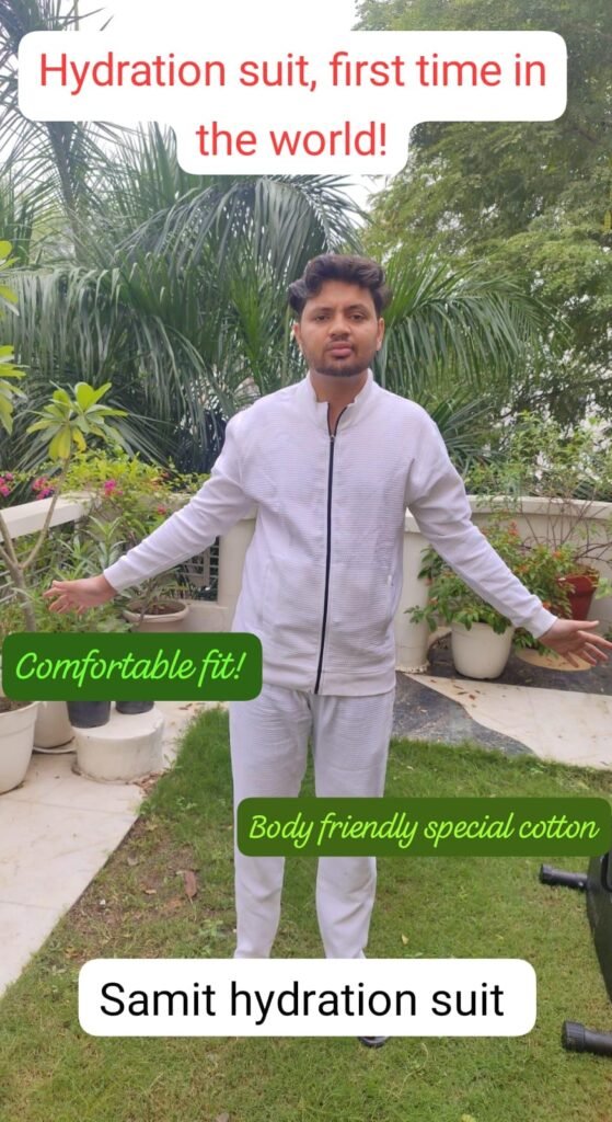 The Hydration Suit is a revolutionary innovation by Sanjay Mittal. Made from premium cotton towel material, this suit is designed to be soaked in clean water and worn for 15 minutes. During this time, water seeps into every pore, hydrating your skin and organs from within.